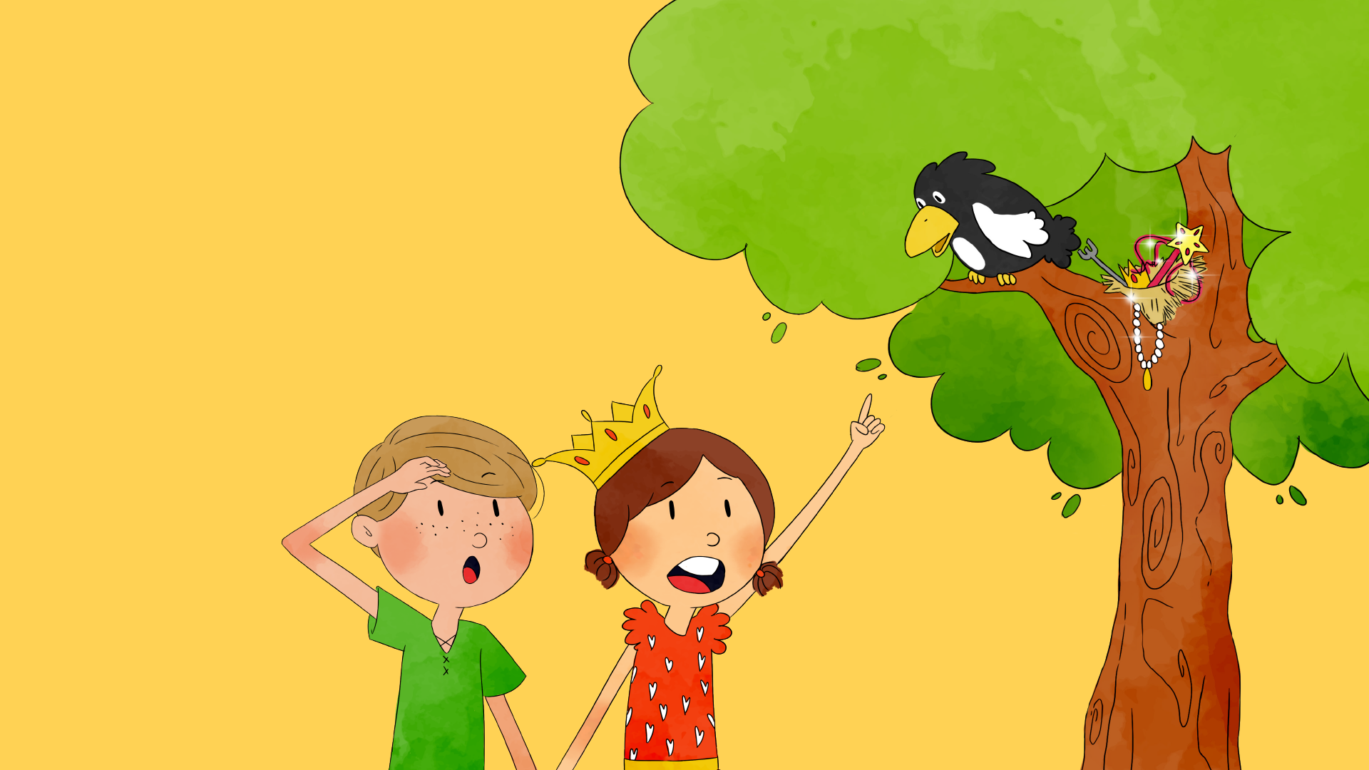 Glansje en Tom wisten het meteen - jij weet dat vast ook - zoeken! En dat deden ze. Ze keken onder struiken, tussen de varens en onder de bladeren. Niets. Na uren zoeken waren ze zo moe dat ze even tegen een omgevallen boom gingen rusten. Terwijl ze zat na te denken waar ze nu nog konden zoeken, keek Glansje omhoog. En daar, hoog in de boom zag ze iets glinsteren tussen de bladeren van een tak. Ze keek nog eens goed en jawel, daar lag het toverstafje. In een nest van een… ekster. Zoals je misschien weet, zijn eksters heel nieuwsgierig. Ze staan er om bekend glimmende voorwerpen als sierraden en zilveren theelepeltjes te ‘stelen’ en naar hun nest te brengen.