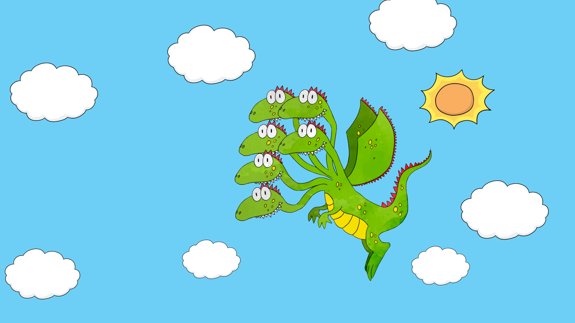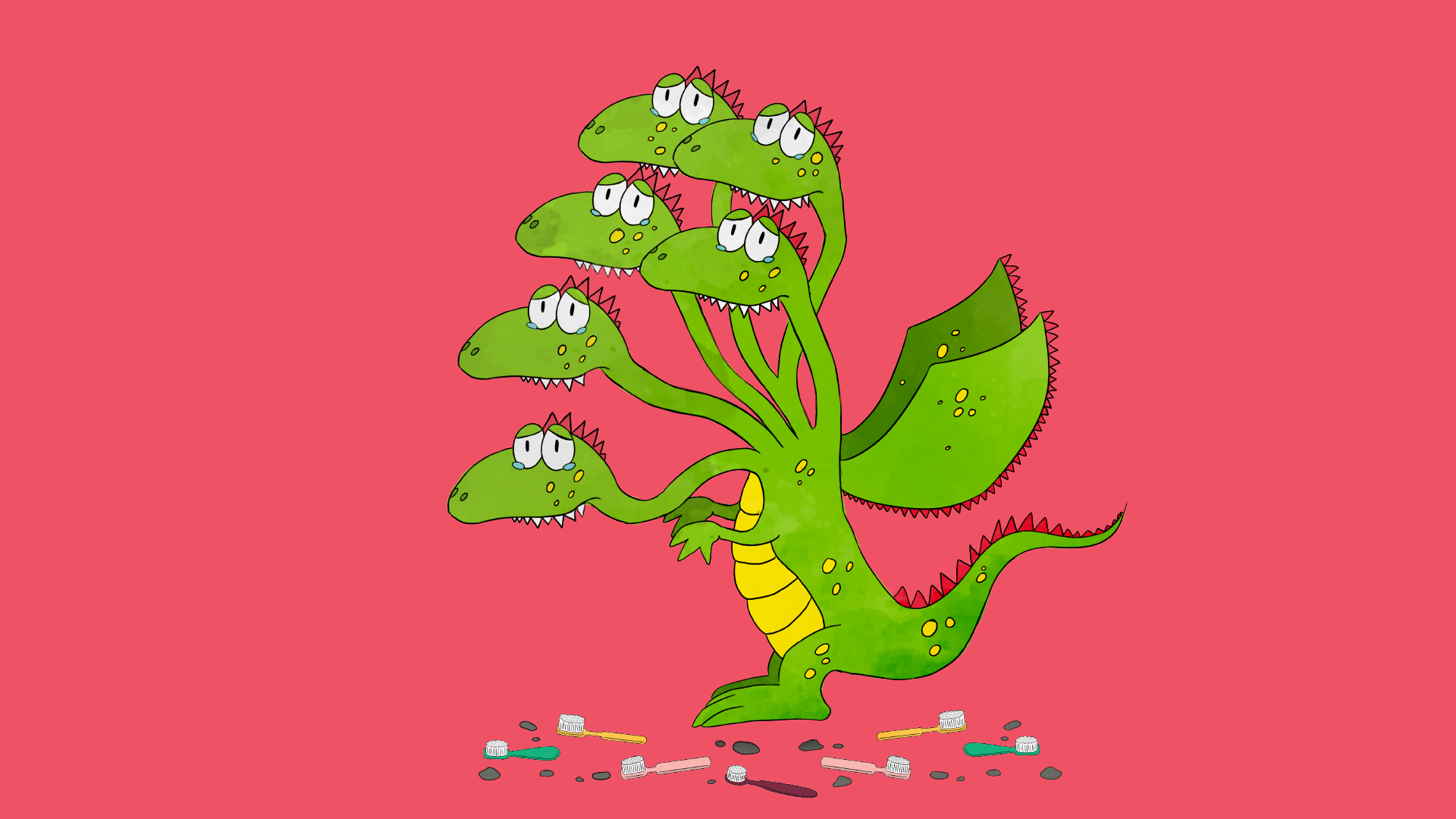 Koning Karel en Koningin Karlijn kwamen meteen naar buiten. Maar een antwoord op die vraag hadden zij niet. Zelf hadden zij ook al uren naar hun tandenborstel gezocht. Koning Karel, die alle mensen in Glansrijk graag gelukkig zag, wilde ter geruststelling net iets zeggen toen er plotseling een grote schaduw over de mensen kwam. Bang was hij niet, maar hij schrok toch wel een beetje. Was het een zonsverduistering? Nee, daar hadden zijn geleerden niets over gezegd. Maar wat was het dan wel? Hij keek omhoog en... werd helemaal wit. Van schrik natuurlijk. Want boven het kasteel zweefde een draak. En geen kleintje ook. Zijn lijf leek net zo groot als het paleis. Hij had twee enorme grote vleugels, een gekartelde staart en vier poten met grote klauwen. Maar dat was nog niet alles. De draak had wel zes koppen. Zes! En bij drie daarvan stond de bek helemaal open. Hij zag paarse tongen en wel honderden tanden en kiezen die ook nog eens geelkleurig en heel vies waren. Droom ik nu?, dacht hij.