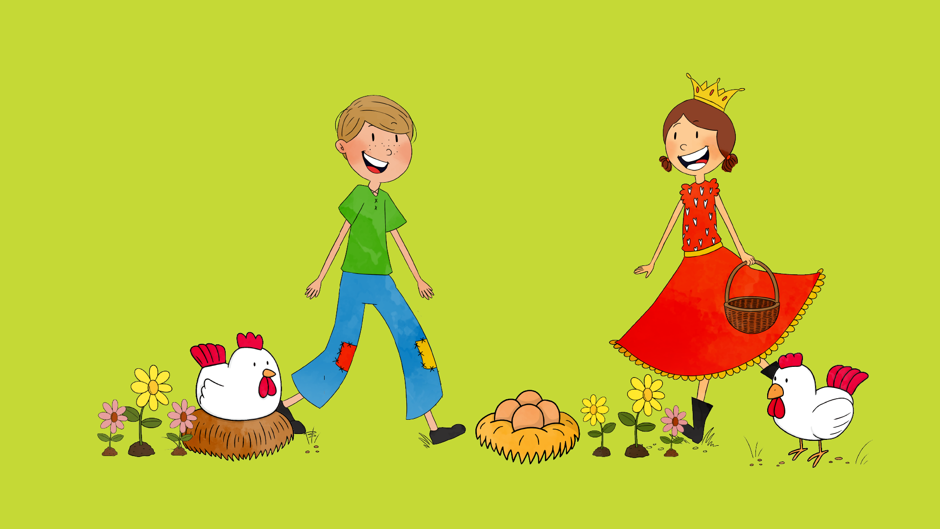 Met hun rieten mandje met wat stro er in liepen Glansje en Tom al eieren rapend door het kippenhok. Na een tijdje hadden ze twee hele manden vol met grote witte eieren. Genoeg voor alle gasten die door Koning Karel en Koningin Karlijn waren uitgenodigd. De kok zal er blij mee zijn. En zij zelf natuurlijk ook, want een eitje of misschien wel twee bij de lente-lunch vonden zij ook zo lekker. Jij toch zeker ook? Maar eerst gingen ze naar de paleistuin. Lekker even in het mooie groene gras liggen en genieten van de bloemen, de bijtjes en het plezier van de spelende kinderen.
